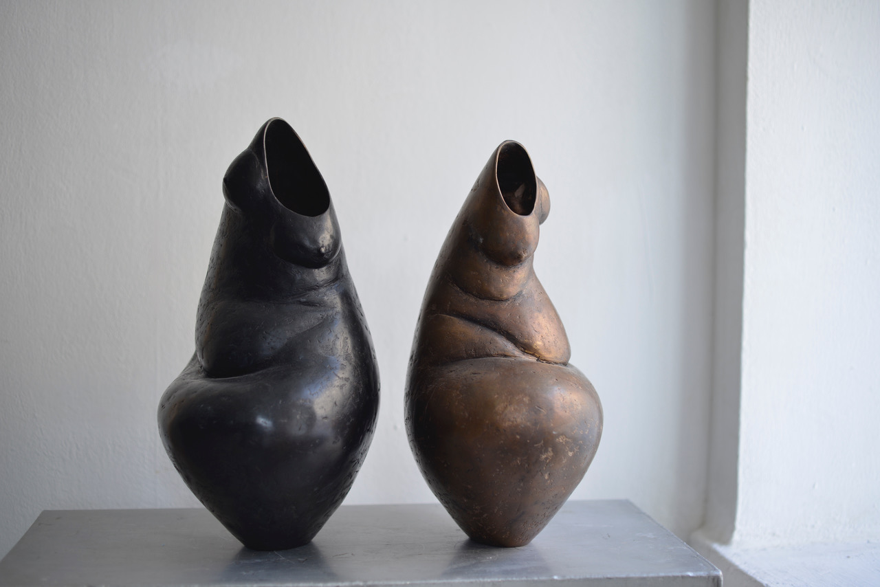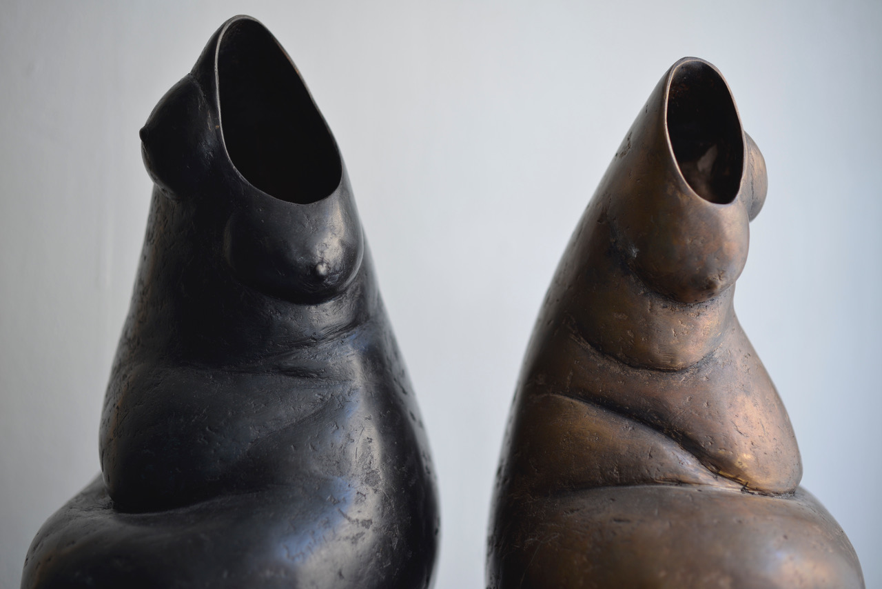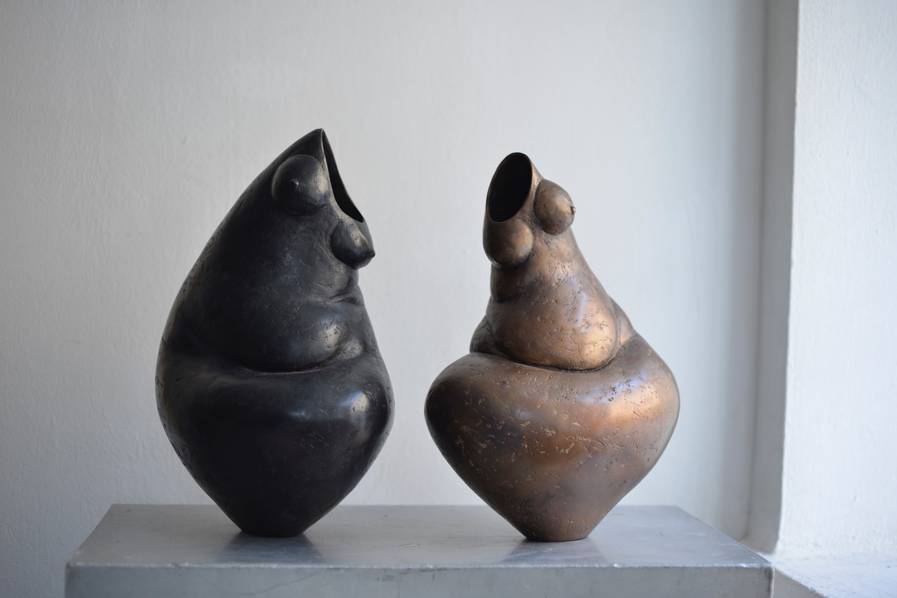 Die einander zugeneigten, weiblich anmutenden Gefäße lächeln mit den Bauchfalten.