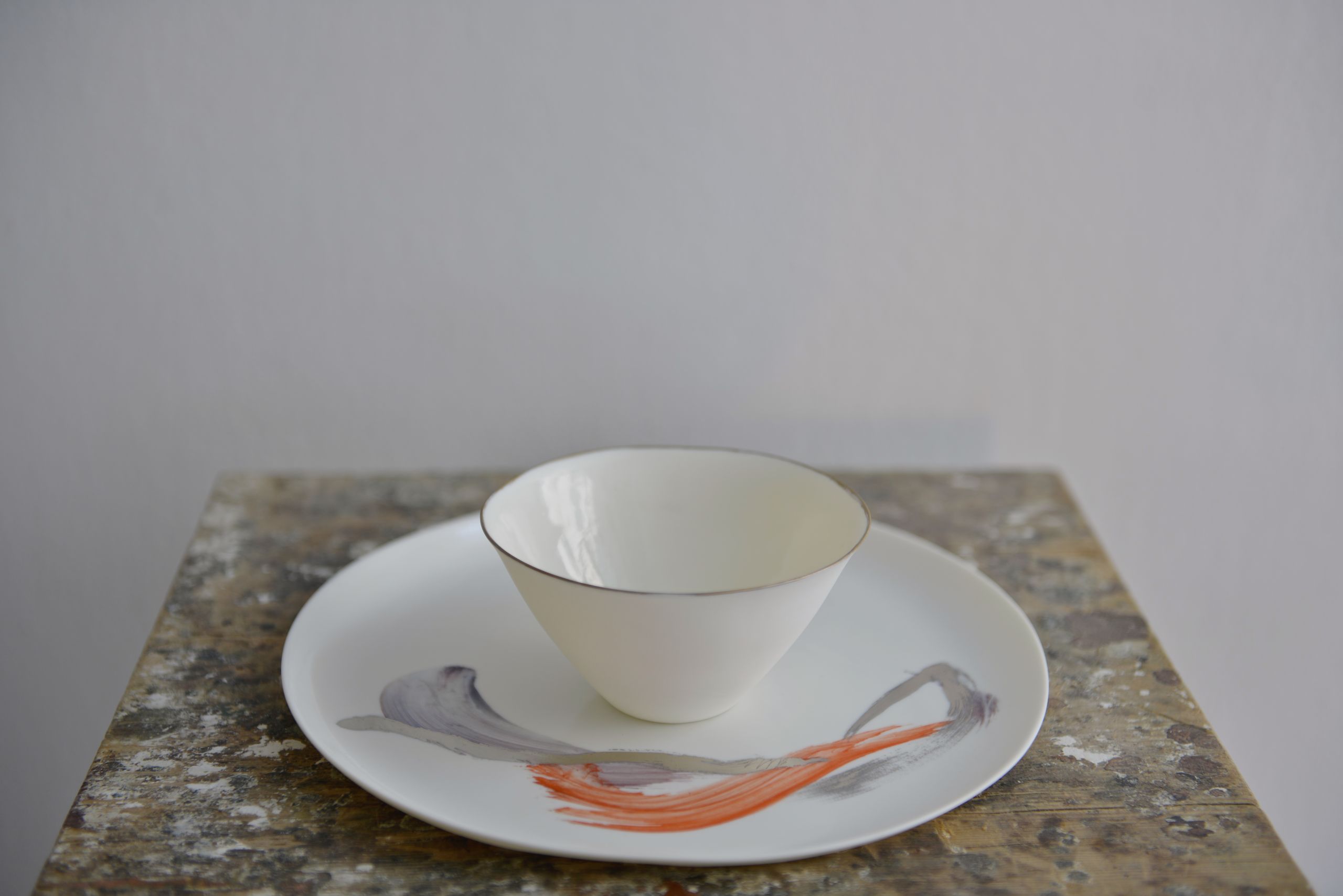 Ein Set (Teller und Schale mit Goldrand) aus Porzellan mit Oxidmalerei; Einzelstück Teller: €72 Größe: Ø 27 cm, Höhe ≈2 cm Schale: €50 Größe: Ø 13 cm, Höhe ≈7 cm
