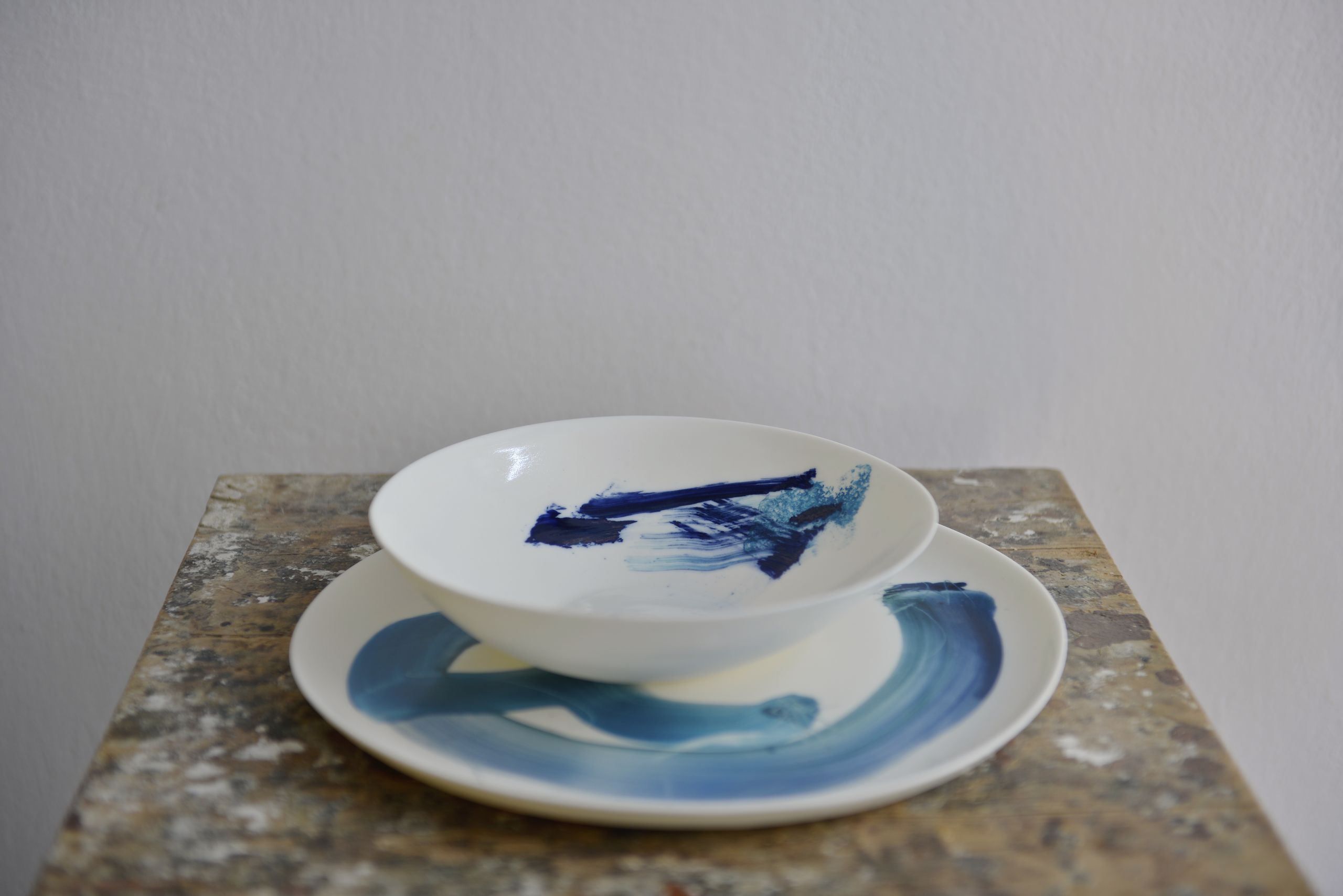 Ein Set (Teller und Schale) aus Porzellan mit Oxidmalerei; Einzelstück