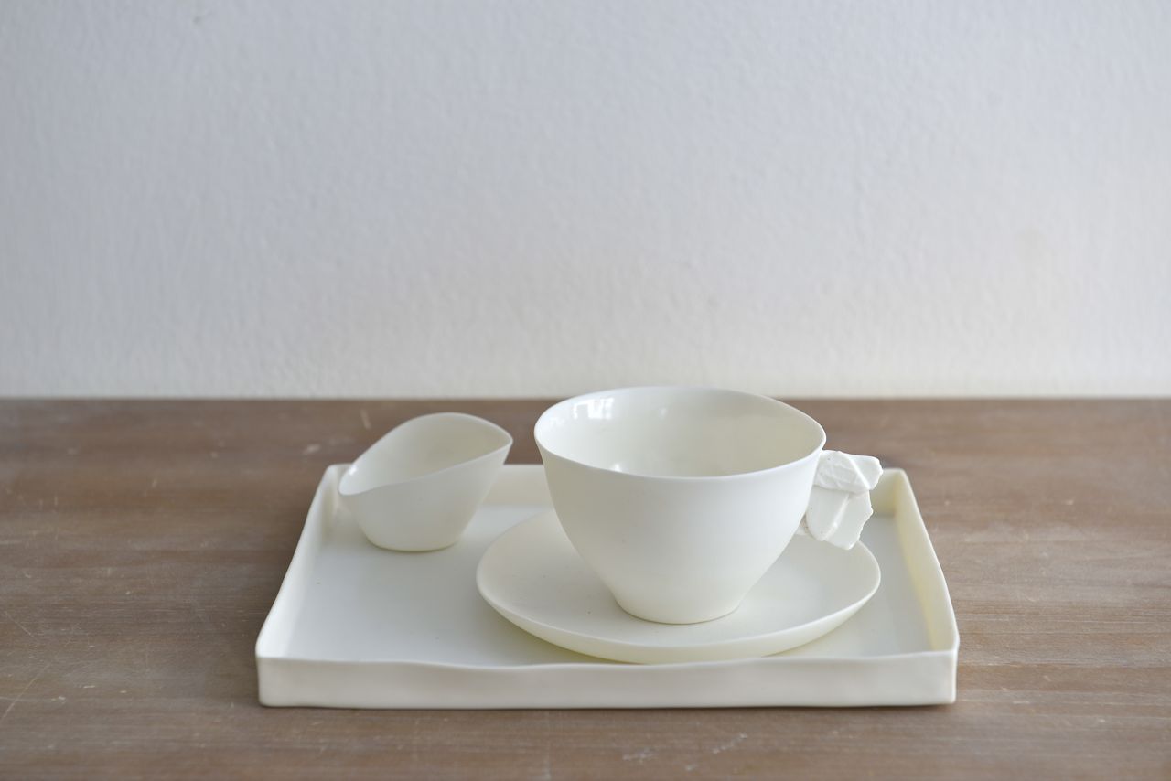 Ein Set ist aus feinstem Porzellan, bestehend aus einer Tasse mit Untertasse ohne Vertiefung, einem Kännchen und einer viereckigen Platte.