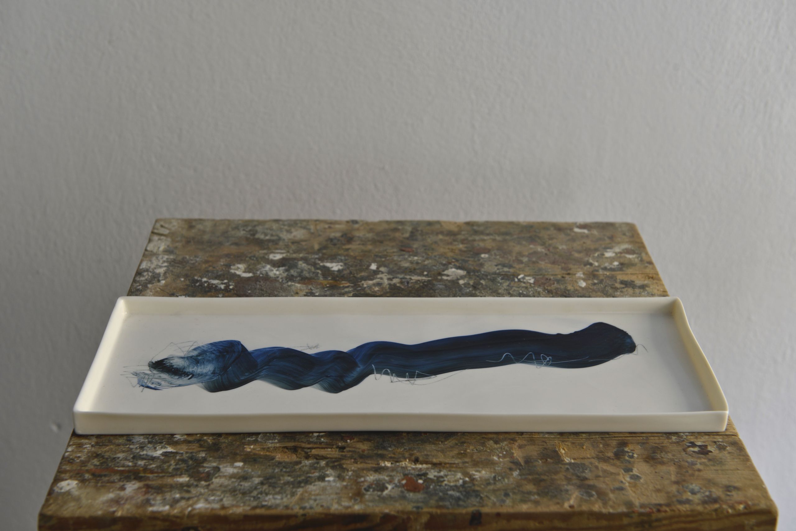 Eine viereckige Vorlageplatte aus Porzellan mit blauer Oxidmalerei; Einzelstück Größe: 36 cm x 13,5 cm x 1,5 cm
